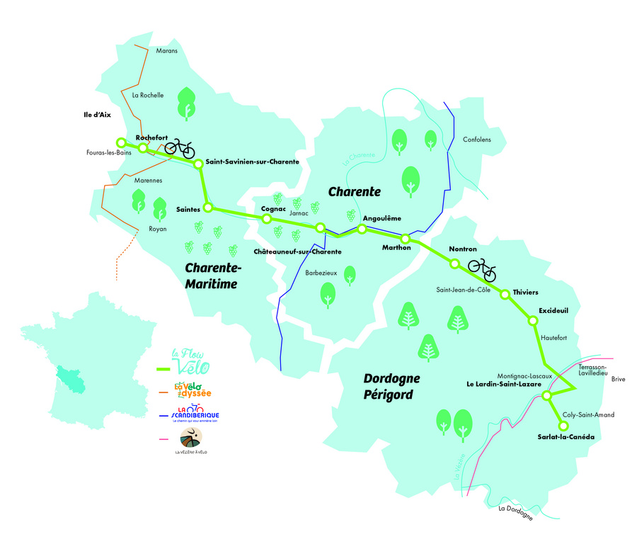 Aux portes du Sud-Ouest, cette véloroute chic et bucolique, longue de 400 km, relie Sarlat en Dordogne à l’île d’Aix en Charente-Maritime. Après une incursion dans le Parc Naturel Régional du Périgord Limousin, elle rejoint Angoulême pour ensuite flirter avec le fleuve Charente, dans un décor de vignes. Au fil de l'eau, Cognac, Saintes, Rochefort sont autant d'étapes "d'Art et d'Histoire"... avant d'embarquer pour l'Ile d'Aix, perle de l'estuaire. Inspirez, respirez, pédalez... sur la Flow Vélo ® . Bon voyage !